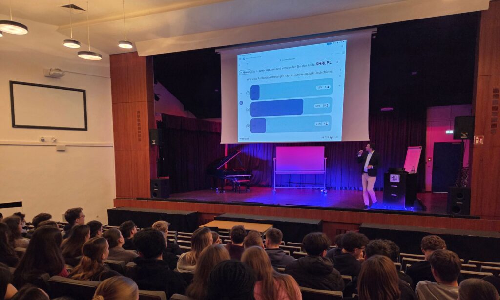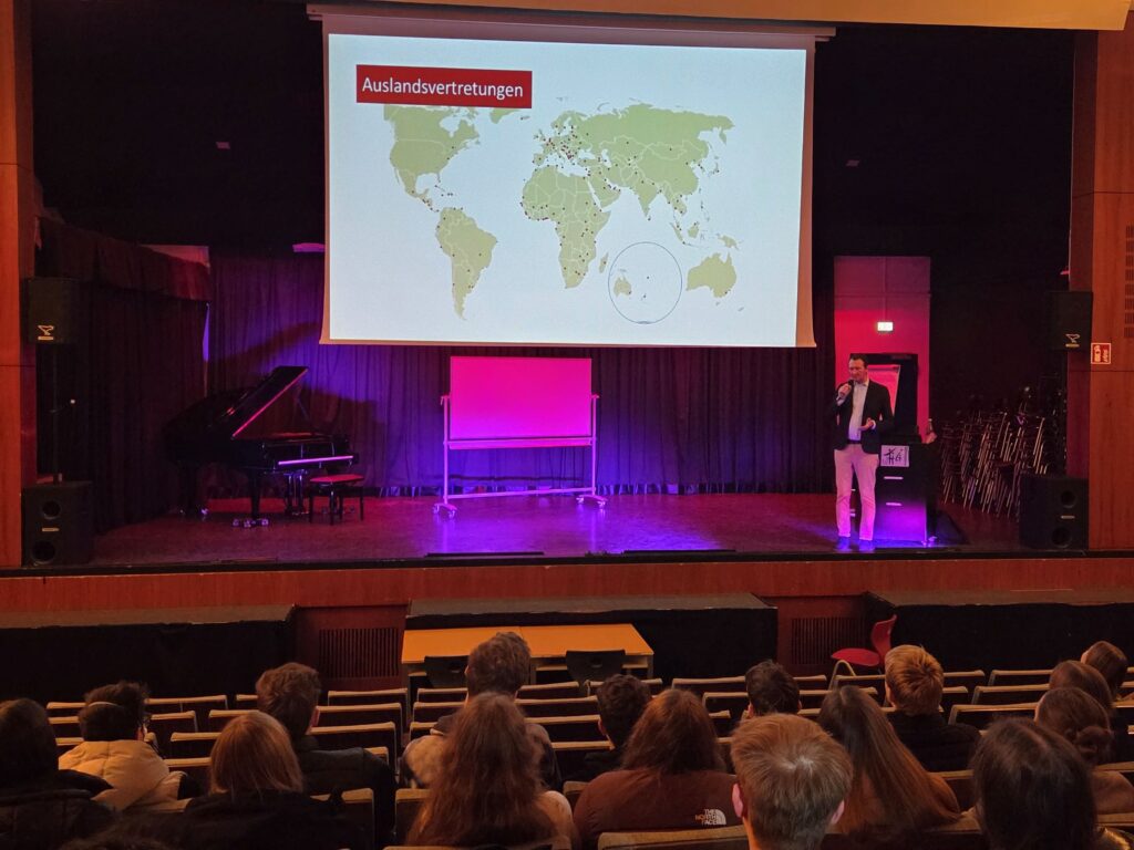 Am 04.12.2025 besuchte Herr Lorenz Strittmatter im Rahmen des „Diplomatie macht Schule“ Programms des Auswärtigen Amtes unsere Schule. Die Veranstaltung fand in der Aula statt, wobei er mit uns, dem 13. Jahrgang, ins