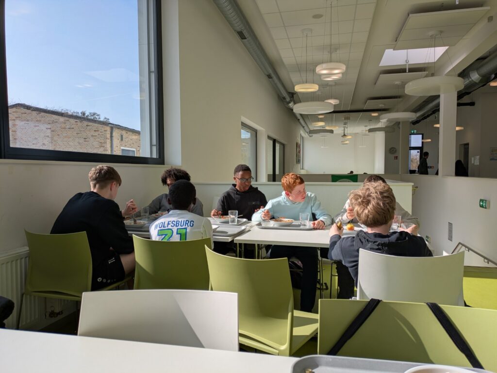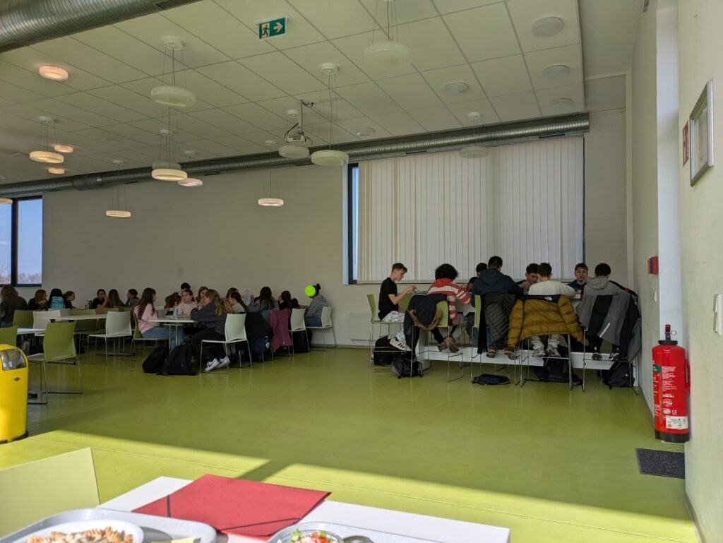 Nach dem Unterricht sind wir in die Mensa gegangen, welche zwei Stockwerke hat und sehr groß ist. In der Mensa haben wir alle gemeinsam Pasta mit Käsesauce und Salat gegessen. Es war lecker.