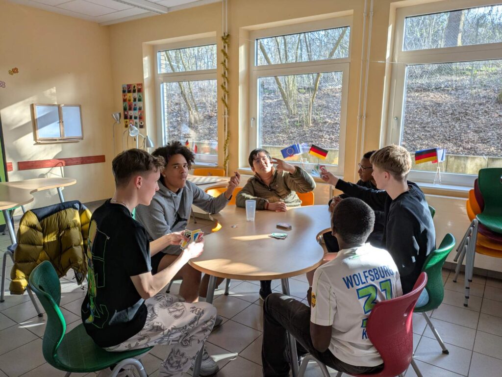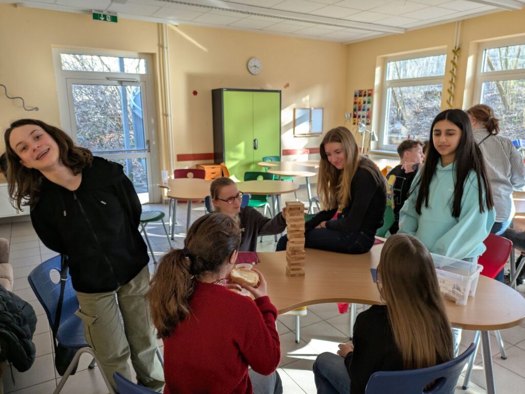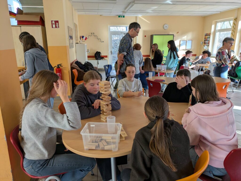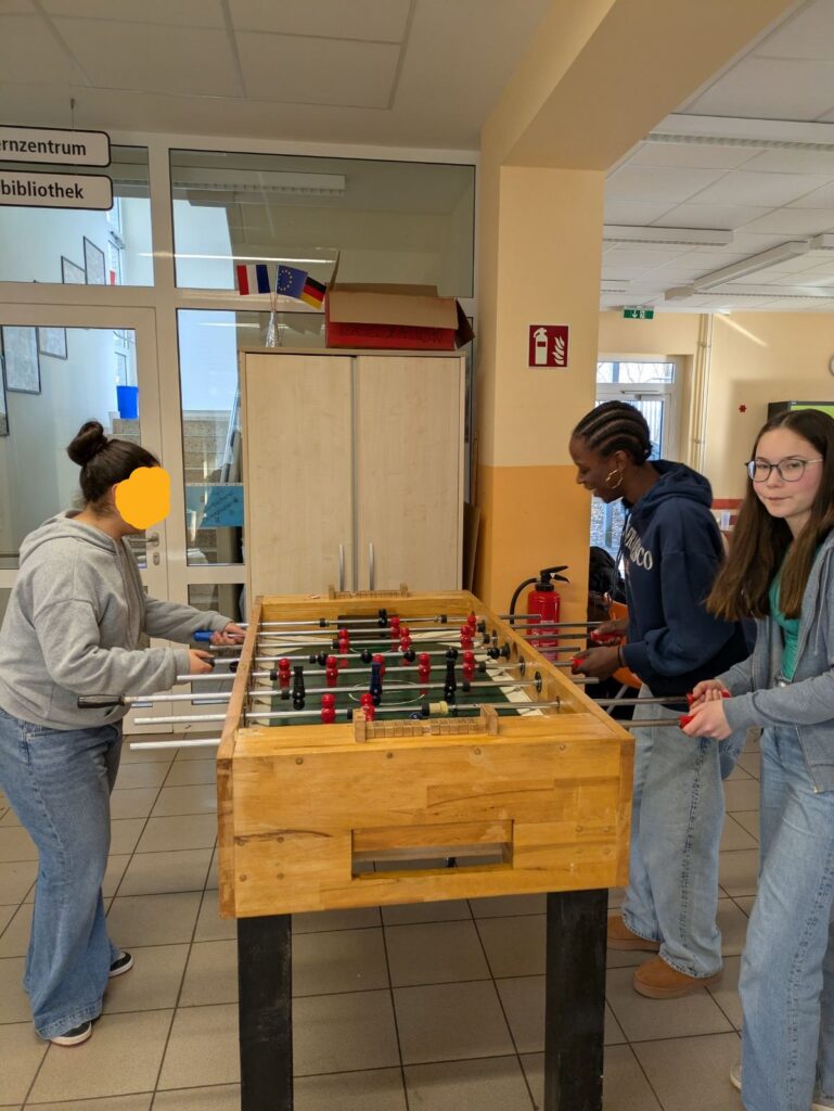 Eine Stunde später sind wir in einen anderen Raum gegangen. Wir haben ein Lied auf Französisch gesungen, das „Steh auf deinem Weg“ hieß. Ein paar Schüler haben uns gefragt, ob wir ihnen bei der Aussprache von französischen Wörtern helfen können. Es war super lustig. Aber es gab viel Lärm. Nach der Musikstunde haben wir in der Pause Wikinger-Schach gespielt, was sehr cool ist. Beim Klingeln sind wir in den Unterricht gegangen. Danach hatten wir WPK, es war unglaublich, wir haben Spiele auf der Tastatur gemacht. Aber es war auf Deutsch. Es war, um die deutsche Tastatur zu lernen. Alle waren nett.
