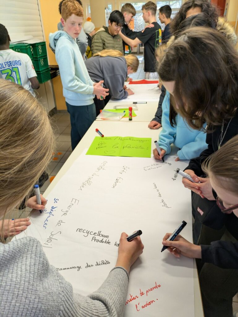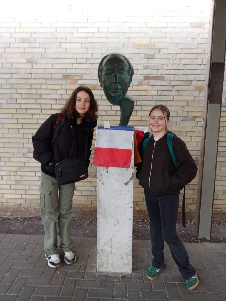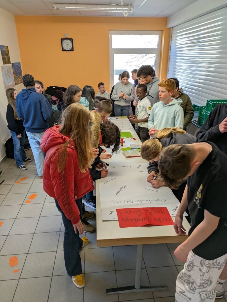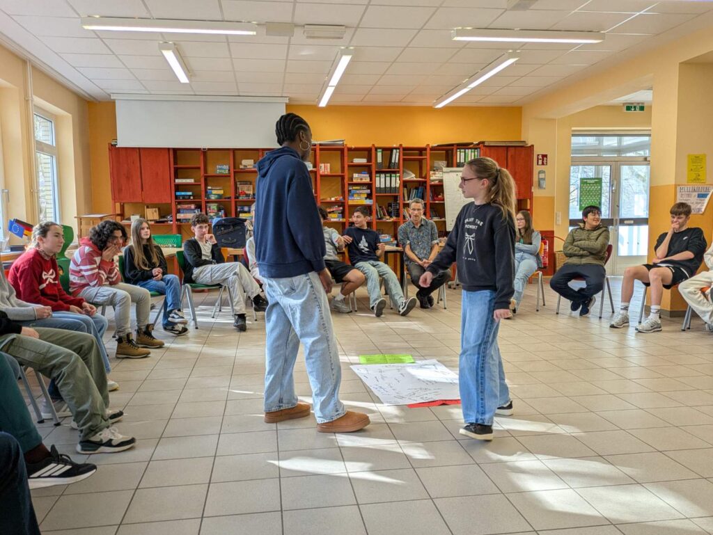 Eine Stunde später sind wir in einen anderen Raum gegangen. Wir haben ein Lied auf Französisch gesungen, das „Steh auf deinem Weg“ hieß. Ein paar Schüler haben uns gefragt, ob wir ihnen bei der Aussprache von französischen Wörtern helfen können. Es war super lustig. Aber es gab viel Lärm. Nach der Musikstunde haben wir in der Pause Wikinger-Schach gespielt, was sehr cool ist. Beim Klingeln sind wir in den Unterricht gegangen. Danach hatten wir WPK, es war unglaublich, wir haben Spiele auf der Tastatur gemacht. Aber es war auf Deutsch. Es war, um die deutsche Tastatur zu lernen. Alle waren nett.