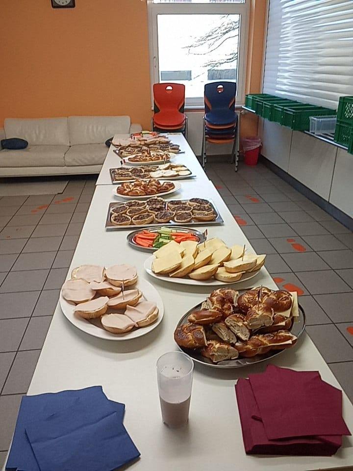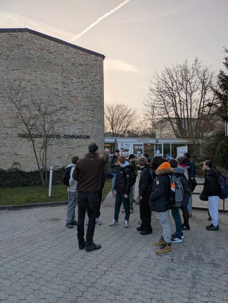 Ce matin, je me suis levée à 6h15, je me suis préparée, puis je suis allée manger le petit déjeuner. A 7h00, nous sommes partis en voiture pour nous rendre au collège. Quand nous sommes arrivées, il n’y avait pas de portail ni de surveillant : ça nous a beaucoup surpris, car en France, il y a des surveillants et un portail pour que les élèves ne sortent pas. Nous nous sommes rassemblés autour de la statue de Théodor Heuss, puis M. Gernert nous a fait visiter le collège qui était très grand. Nous nous sommes rendus dans une pièce où les correspondants nous attendaient. Il y avait des sandwichs et des gâteaux. M. Gernert et Mme Tessier nous ont distribué nos emplois du temps et la récréation a sonné. Sophia et ses amies m’ont montré la récré et m’ont accompagnée en cours de musique.